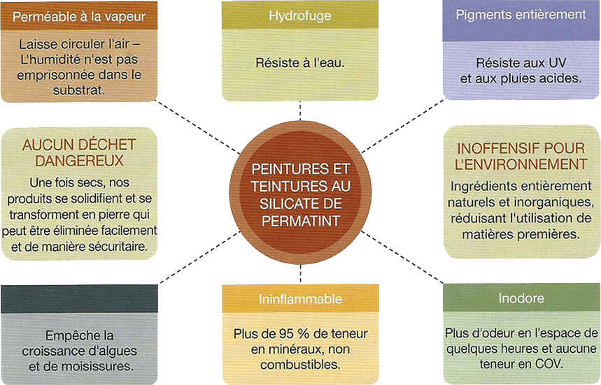 Les peintures et les teintures à base minérale fonctionnent différement des peintures traditionnelles. Elles pénètrent la surface sur laquelle elles sont appliquées et cristallisent en profonde. Plutôt que de coller seulement en surface, nos peintures minérales subissent une réaction chimique qui ancre de manière permanente h couleur dans le substrat. En termes simple. elles deviennent partie intégrante de la brique plutôt que de le recouvrir. Comme la peinture est composée de minéraux, elle conserve donc les propriétés naturelles du revêtement, soit de respires et d'évacuer l'humidité interne. Nos pigments inorganiques naturels en oxydes de fer sont résistants aux UV, ce qui permet à nos peintures et à nos teintures de conserver leurs couleurs riches et éclatantes. Nos produits sont couverts pas une garantie de remplacement de 10 ans et ont une durée de vie pouvant excéder 20 à 30 ans, sans entretien.